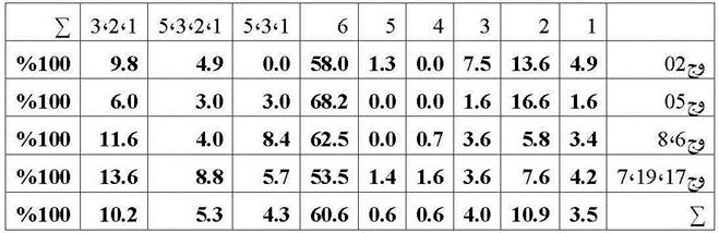 1=النظافة، 2=مساحات خضراء، 3=فضاءات لعب الأطفال،4=مساحات التوقف، 5= الإنارة العمومية، 6= كل عناصر التهيئة الخارجية،وج= الوحدة الجوارية،  ∑= المجموع