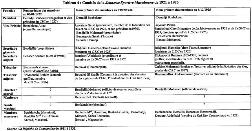 Ce processus de réactivation du collectif sera confirmé quelques jours plus tard par la mise en place d'un comité soutenu par les notabilités de la cité comme MM. le docteur Moussa (ancien président del'E.C.M.C. en 1917, délégué financier), Benbadis et Lounici (conseillers municipaux), Mokhtar Hadj Saîd ( avocat fort connu pour ses multiples actions de bienfaisance au sein du comité de secours aux indigènes dont il était le président ); sans oublier les autorités locales comme le préfet ou le maire Morinaud (la Dépêche de Constantine du 03/01/1922 ). Tous ces soutiens restaient insuffisants, dans la mesure où l'amélioration de l'encadrement de la société, sensible au fil des années, n'a pas eu d'efficience sur le terrain sportif. A défaut d’informations contraires, la J.S.M.C. donnait l’impression de "bouder" le sport institutionnel et de lui préférer des formes de pratiques physiques et sportives plus indépendantes. Comment comprendre autrement que de temps à autre et de façon épisodique, le club organisait quelques rencontres amicales de football avec d'autres sociétés sportives non intégrées. Mais il n'y a pas que cet aspect qui faisait la singularité de ce collectif. A examiner la composition humaine des différents comités qui se sont succédés de 1921 à la fin 1925 (cf.tab no04) trois données d'importance méritent d’être relevées:
