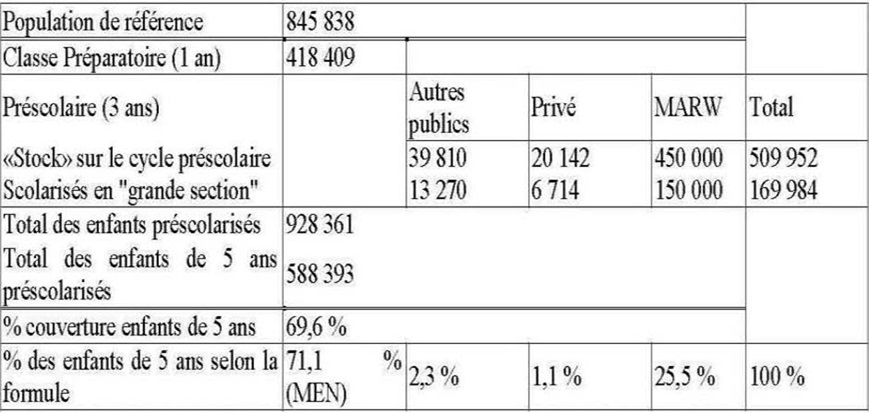 En ciblant les seuls nouveaux entrants en primaire à la rentrée 2015, qui ont été préalablement préscolarisés, le nombre couvert par une formule ou une autre est de 588 400, représentant alors 69,6 % de la population nationale d’âge correspondant. Sur cette population couverte, 71 % l’ont été selon la formule de la Classe Préparatoire et 25 % par une structure dépendant du MARW; les deux autres formules considérées (privé, entreprises publiques et administrations) ne comptent ensemble que 3,4 % du total.