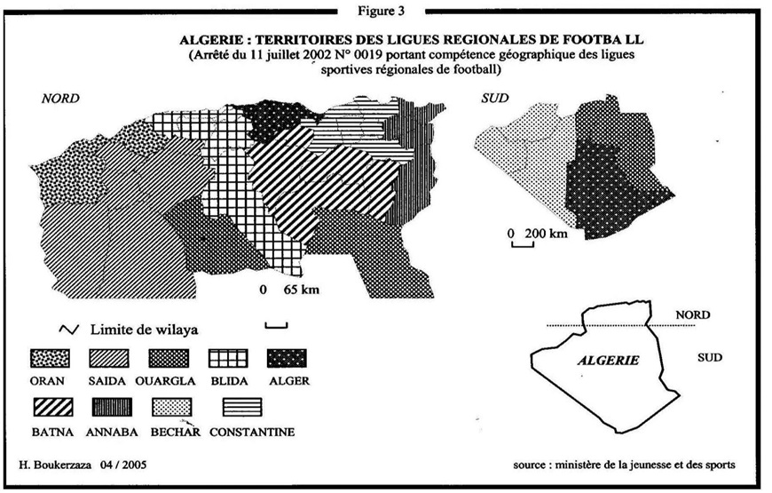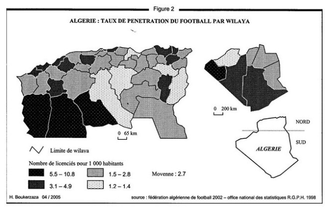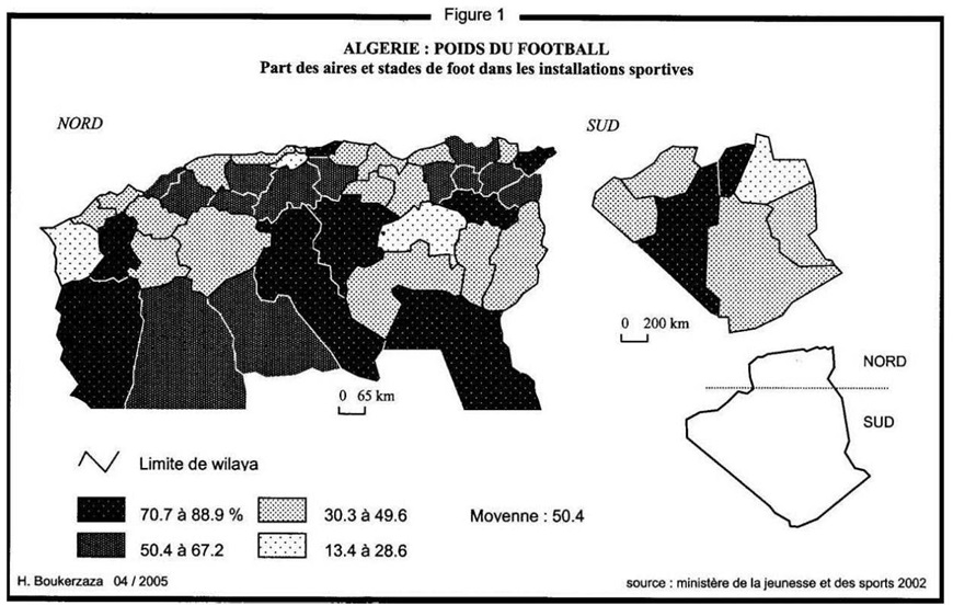 S’agissant du football, il est nécessaire d’établir le lien entre le niveau des équipes et la place des villes dans la hiérarchie urbaine, de vérifier si le modèle qui attribue aux plus grandes villes les plus grandes équipes, s’applique au cas algérien; comme il est indispensable de saisir ce sport dans sa dimension urbaine. Le football (de haut niveau) est en effet «analysé comme un révélateur de la structuration de l’espace» parce qu’il «participe aux processus de territorialisation, qu’il appréhende comme un fait social contribuant à la conversion de l’espace en territoire»1.