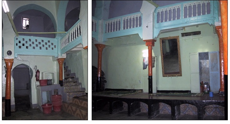 - Bit el Berda : la chambre tiède et intermédiaire, parfois sorte de sas l’usager qui introduit le baigneur à la chambre chaude. Aujourd’hui, nous constatons que cette pièce a d’autres attributions : elle sert notamment comme réserve d’importantes quantités d’eau. C’est également un lieu qui s’est peu à peu dégradé du fait de son abandon par les usagers qui s’attardent beaucoup moins qu’autrefois.