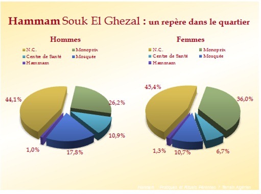 Pour moins de deux pour cents de nos enquêtés, hammam Souk el Ghezal, constitue un repère d’orientation dans le quartier. Il faut noter qu’il se fond dans le paysage urbain. A l’inverse, les mosquées sont plus visibles et identifiables grâce à leur minaret.