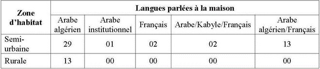 En effet, l’usage de la langue française est absent dans les zones reculées. Quant aux enquêtés qui résident dans les zones urbaines, ils affirment y avoir recours simultanément avec l’arabe algérien dans l’espace familial. Il est donc nécessaire de souligner que l’usage d’une langue étrangère dans la famille contribue au progrès des enfants à l’école.