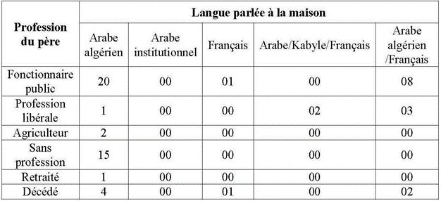 Nous établissons un lien hypothétique entre le métier exercé par le père et la langue dont il fait usage au sein de la famille. D’après le tableau ci-dessous, l’usage de la langue française est présent chez les fonctionnaires au sein de l’Etat et qui sont au nombre de 09. Nous supposons que ce sont des enseignants, des médecins, des administrateurs. Par ailleurs, le recours à l’arabe dialectal demeure émergent et concerne toutes les catégories.