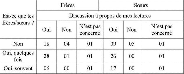 Dans ce même tableau, les enquêtées affirment qu’elles discutent souvent avec leurs sœurs des lectures qu’elles font ; elles sont au nombre de 17. Cela représente un chiffre largement supérieur à celui relatif aux frères. Cela montre que l’échange entre sœurs à propos des lectures est plus aisé dans la mesure où c’est un centre d’intérêt commun entre elles.