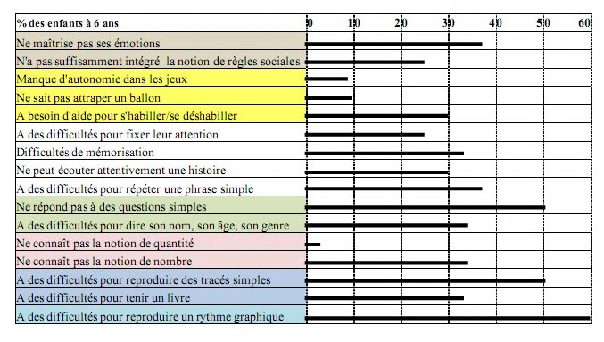 Pour donner un exemple, l’enquête de Mingat et Seurat[11] met en évidence le niveau d’habilité des enfants malgaches de six ans comme le montre le tableau ci-dessous.