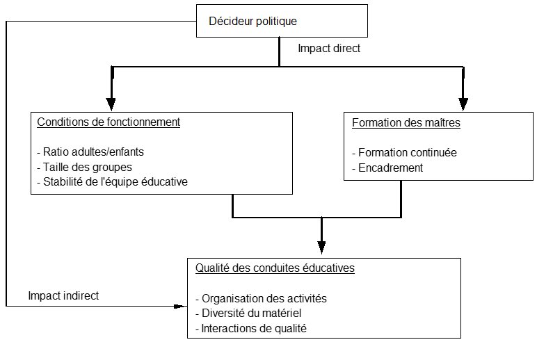 Le modèle de Crahay[52] (cf. figure ci-dessous) montre clairement les facteurs qui ont un impact direct ou indirect sur la qualité de l’éducation préscolaire.
