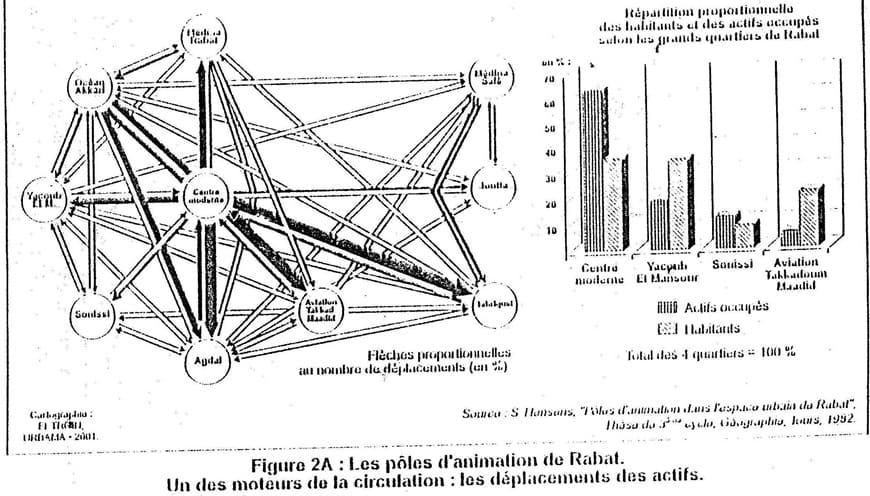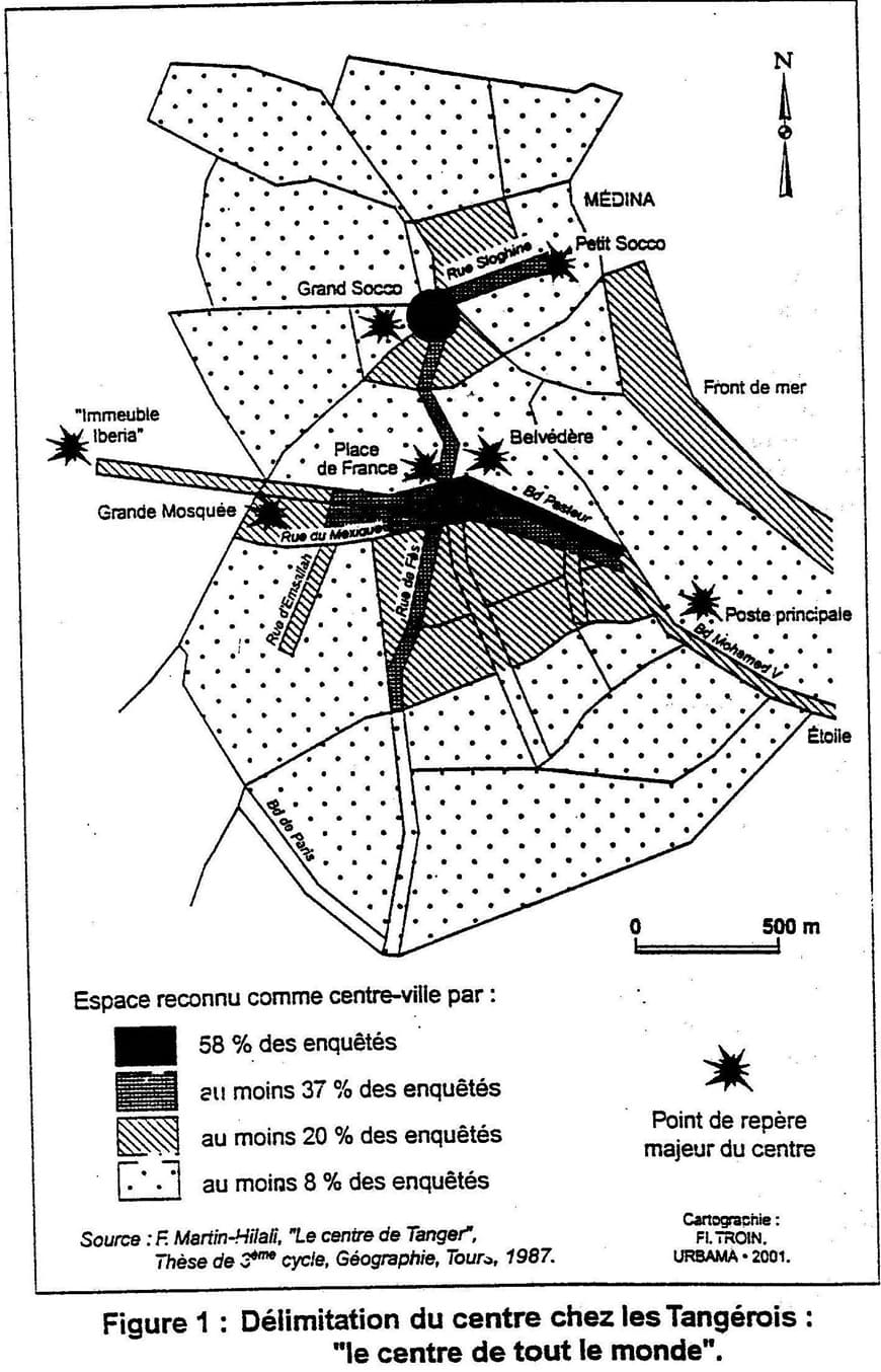 Cherchant à déterminer les pôles d’animation de Rabat, S. Hensens (1982) a montré qu’on ne pouvait s’en tenir aux seuls flux domicile-travail, généralement privilégiés par les urbanistes, mais qu’il importait de prendre en considération tous les types de déplacements, y compris ceux occasionnés par les activités de loisirs et de chalandise, lesquels se répartissent dans le temps de manière plus fluide que les précédents. Constatant – ce qui n’est certes pas une surprise – que la pratique des habitants motorisés était relativement indépendante de la distance, au contraire de celle des piétons (généralement ceux qui ont les revenus les plus bas), l’auteur constatait que, à Rabat, la Médina joue un rôle complexe, à la fois d’approvisionnement et de services quotidiens, banals, pour les catégories sociales pauvres, de lieu d’achats au moins hebdomadaires pour les résidents pauvres des périphéries urbaines, mais aussi de lieu d’approvisionnement régulier, bien qu’avec une fréquence moindre, pour toutes les catégories sociales qui peuplent la ville en ce qui concerne des produits tels que l’habillement, les chaussures, les tissus, la vaisselle et divers autres qui parviennent en ville à partir de Ceuta par les circuits de la contrebande. Même si inégalement, la centralité de la Médina de Rabat est - du moins au début des années 80 - affirmée pour tous les habitants de la cité (figure 1); la sélectivité des pratiques sociales selon les niveaux de revenus conduit cependant S. Hensens à qualifier cette Médina de péri-centrale – terme également utilisé par F. Hilali-Martin (1987) pour Tanger (figure 2), la désignation de "centre" étant réservée au quartier européen de la capitale marocaine . L'usage du qualificatif "péri-central" pour désigner la Médina nous semble discutable, car elle pourrait signifier que la centralité des pauvres ne “ vaut ” pas celle des riches; c’est pourquoi nous préférons la désignation de “binôme central ” utilisée par M. Belfquih et A. Fadloullah (1986) à propos de Rabat-Salé pour qualifier la centralité conjointe de la médina et du quartier ex-européen. Mais les études consacrées à  Rabat montrent aussi que, simultanément, les quartiers de la ville "moderne" enregistrent une fréquentation assez intense et régulière des habitants domiciliés aussi bien dans la Médina que dans les périphéries.