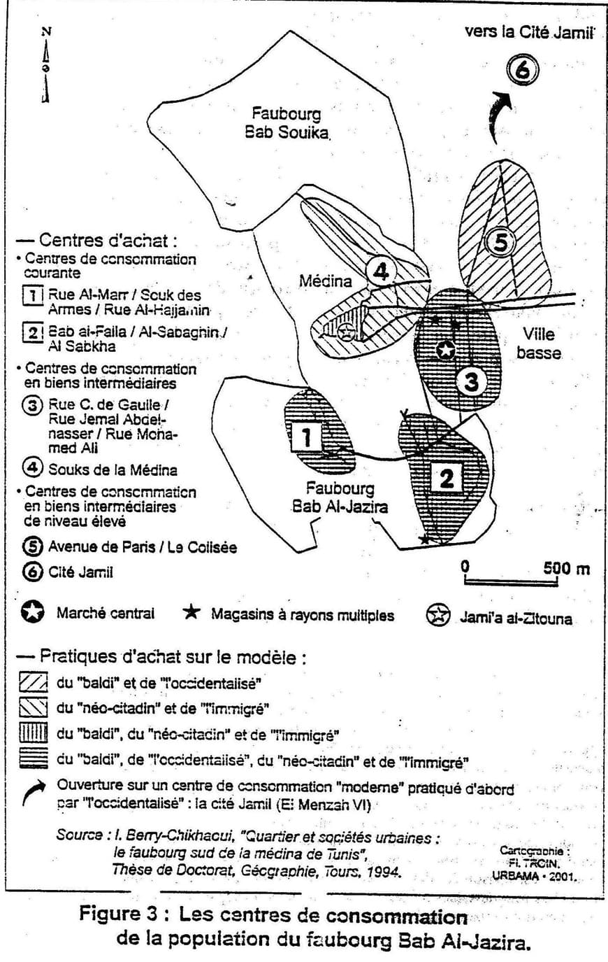 Dans un article ultérieur consacré à Tunis, Jean-Marie Miossec (1987) nuance cependant ce constat : selon lui, en effet, ce seraient plus les caractéristiques “culturelles ” des habitants que leur appartenance  à telle ou telle catégorie socio-professionnelle ou à tel ou tel groupe de revenus qui détermineraient, fondamentalement, les comportements des clientèles. Il distingue, à ce propos, entre les comportements de trois catégories d'habitants, les beldi, les “néo-citadins” et les “occidentalisés” pour révéler les pratiques complexes du centre-ville, étant entendu que ceux qui constituent le dernier groupe ont pratiquement rompu avec le centre-ville et n'en fréquentent plus que très occasionnellement les rues commerçantes et les services. Examinant les choses à partir de la médina et, plus exactement, de son faubourg sud (Bab al-Jazira), Isabelle Berry-Chikhaoui (1994) remarque quant à elle que les habitants de ce quartier relativement bien équipé en commerces, services et artisanat, offrant des biens et des services à la fois banals et intermédiaires, “traditionnels ” et “modernes ”, ne se sentent nullement marginalisés à l’intérieur de l’agglomération urbaine et qu’ils estiment pleinement vivre en centre-ville. Analysant les pratiques spatiales et le paysage commercial, l’auteur confirme que rien ne permet d’opposer de manière rigide une “ centralité pauvre ” à une “ centralité riche ”, dans la mesure où, pour elle aussi, le clivage le plus opérant est d’ordre socio-culturel, étant entendu toutefois qu’associer les catégories aisées à la “modernité ” et les catégories populaires à la “tradition ” est bien trop simplificateur[8] (figure 3).Quoi qu'il en soit, I. Berry-Chikhaoui conteste avec force la conception qui, idéalisant le modèle citadin baldi au détriment de toute autre construction sociale, nouvelle ou renouvelée, nourrit l’idée que les “nouveaux ” venus en médina, parce qu’ils seraient d’origine rurale[9], ne pourraient jamais élaborer des pratiques sociales privilégiant la culture urbaine plutôt que celle de leurs régions d’origine, faire leurs des espaces hérités d’une culture citadine hautement élaborée, s’y organiser économiquement et socialement tout en insérant dans leurs pratiques certains des héritages du passé; une conception qui, en un mot, refuse de penser que ces nouveaux venus puissent se citadiniser…