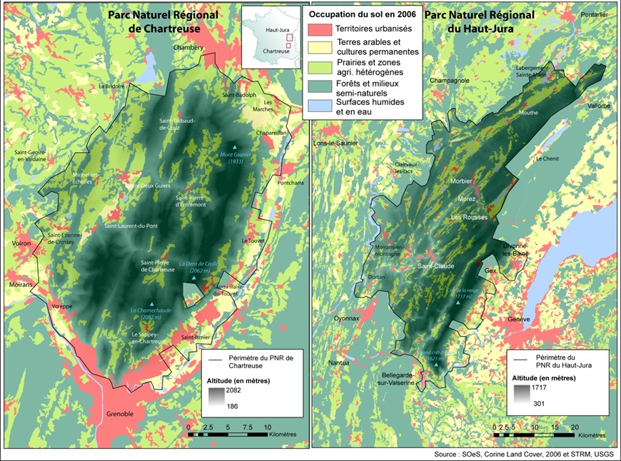 Figure 5 : Les parcs naturels régionaux de la Chartreuse et du Haut-Jura en 2006 : relief et occupation du sol