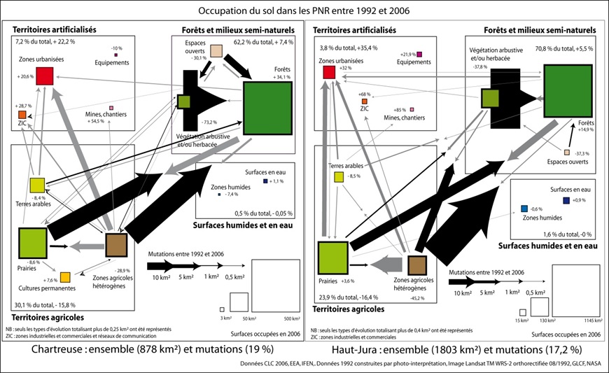 Les dynamiques à l’œuvre entre 1992 et 2006 sont mises en évidence par le biais d’une matrice présentant les trajectoires de l’occupation du sol (fig.6). Les stocks[33], qui indiquent les surfaces occupées en 2006, montrent bien les similitudes et les différences entre les deux parcs : tous deux sont très forestiers, et les prairies constituent le principal pendant à ces paysages fermés ; en revanche, la Chartreuse est davantage urbanisée, elle offre des paysages marqués par une agriculture semi-intensive dans l’avant-pays, et par des espaces ouverts en altitude. Pour autant, en dépit de ces contrastes, les parcs présentent des dynamiques d’occupation du sol comparables (fig.6) : si on raisonne en valeurs relatives, les flux[34] se retrouvent dans des directions équivalentes et des proportions proches d’un parc à l’autre.