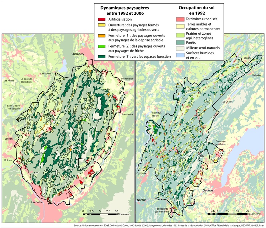 Les parcs naturels régionaux sont des terrains de choix pour l’étude des évolutions paysagères, étant donné leurs prérogatives de gestion de la multifonctionnalité des paysages ruraux. Nous avons choisi de prendre pour exemple la Chartreuse (Préalpes) et le Haut-Jura (Jura) : appartenant à des massifs différents, on peut se demander si leurs dynamiques paysagères sont comparables ou si, au vu de leurs situations respectives sur le territoire français, elles se singularisent (fig.5).