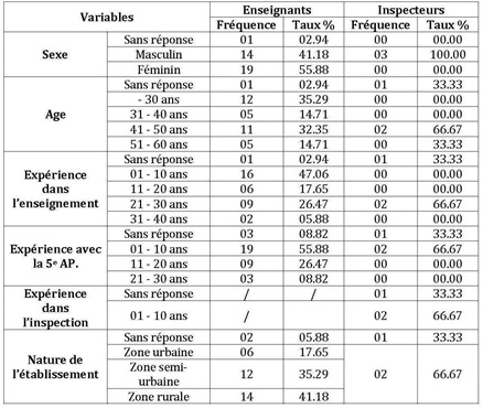Nos informateurs (trente-quatre enseignants et trois inspecteurs) ont des profils variés (cf. tableau 01 ci-dessous).