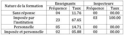 Deux tiers (67.65%) des enseignants-informateurs répondent que la formation était imposée par l’institution, « cette formation est obligatoire » (E18). Un autre groupe (14.71%) répond qu’ils se sont formés personnellement. Pour les inspecteurs, l’intégralité de leurs réponses montre que la formation était imposée par l’institution.
