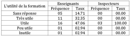 Les trois inspecteurs et la plupart des enseignants estiment que la formation suivie était utile. Selon quelques informateurs, elle a permis de « reconnaitre les démarches à poursuivre pour le système éducatif » (E09), et d’« avoir un aperçu sur la pédagogie de projet. » (E20). Un enseignant répond que sa formation n’était pas utile parce qu’elle « n'était pas pratique, ce qui n'a pas donné de résultats. » (E3).