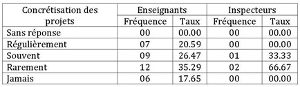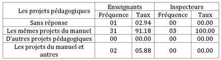 Les trois inspecteurs et la grande majorité des enseignants-enquêtés (91.18%) déclarent que les projets pédagogiques exploités en classes sont ceux du manuel scolaire. Ils pensent que « ces projets sont imposés par le ministère » (E13, E17), et qu’ils suivent « le programme officiel » (E03). Pour deux autres enseignants, ils font ce choix « pour préparer les élèves à un examen national commun » (E20, 21). Seulement (05.88%) des enseignants enquêtés énoncent qu’ils intègrent d’autres projets avec ceux du manuel.