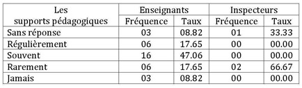 Ici, les avis des enseignants et des inspecteurs sont contradictoires. Les deux tiers des enseignants affirment qu’ils diversifient les supports pédagogiques dans leurs pratiques, ils utilisent « histoires racontés, BD, vidéo et audio » (E17). Alors que deux inspecteurs répondent que les supports sont rarement utilisés par les enseignants « à cause du manque des moyens audiovisuels » (I02). Certains enseignants sont contre l’intégration de ces aides didactiques, « je ne vois aucun intérêt là-dessus » (E04).