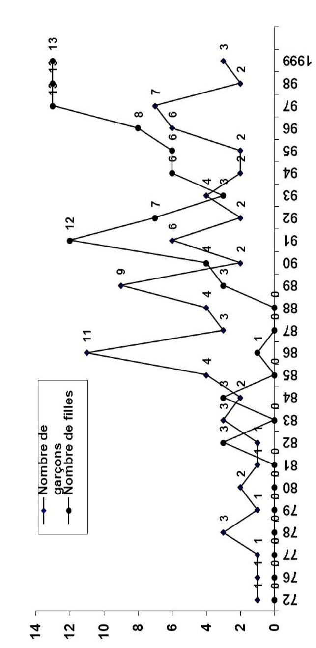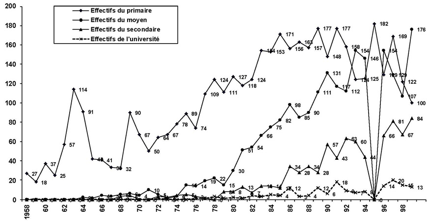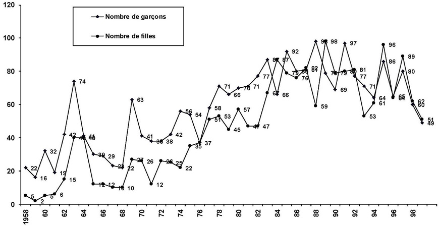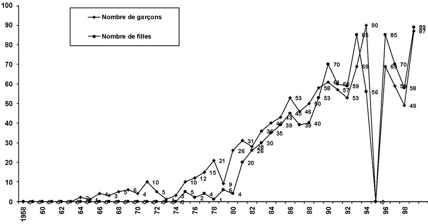 Cette dynamique sera maintenue durant la décennie 1980, car sur les 1500 élèves ayant fréquenté le primaire au cours de ces années, 46,6% étaient des filles. Elles sont en revanche 44,61% à avoir fait le collège sur les 742 collégiens et 37,5% le secondaire sur les 192 lycéens de cette décennie. En outre, la décennie 1980 se distingue des précédentes par l’accès des filles à l’université avec un taux de fréquentation évalué à 20,41% sur 49 bacheliers reçus au cours de cette décennie. Les statistiques évoluent encore à l’avantage des filles dès le primaire, à partir des années 1990. En effet, c’est durant cette période que les filles rattrapent leurs confrères au primaire avec un taux de fréquentation de l’enseignement primaire estimé à 49,93% sur les 1434 élèves. Mais elles les devancent pour la première fois au collège avec 51,55% sur 1226 collégiens et au lycée avec 58,41% de fréquentation de l’enseignement secondaire sur les 565 lycéens de cette décennie. Enfin concernant l’université, les filles couronnent toute cette progression avec un taux de 68,47% bachelières sur les 111 admis durant cette décennie.