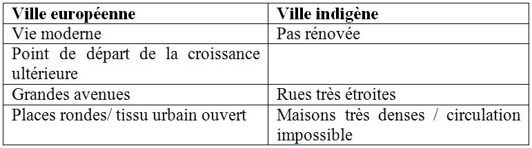 Toujours dans les mêmes textes, nous retrouvons cette comparaison entre ville indigène et ville européenne :