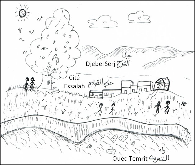 Quand les garçons, par des jours de vacances, estimaient que le dépôt est vide et qu’il n’y avait rien à récupérer, ils passaient des journées entières à jouer avec les chiens, provocation par des jets de pierres et fuite et c’est le « sauve qui peut » ; on peut bien imaginer les réflexes des chiens, car on peut les faire éloigner comme on peut les faire courir derrière (…). À la fin des années 1970, des rifiyins [des ruraux] sont venus des rifs [des campagnes] et des régions aux alentours de Siliana pour s’installer dans ce quartier, et commença alors al bină al ghayir kanouni ou al bină al faoudhaoui ou al bină al âachouaï [la construction illicite, illégale, spontanée], et des maisons poussèrent sur les lieux comme des champignons; alors, les pauvres garçons du quartier trouvèrent une solution à leurs petites bourses ; ils allaient chercher l’eau depuis Oued Temrit ; pour les constructeurs, dans des tonneaux au prix de quelques millimes[6], et le soir, revenus au quartier, ils faisaient les comptes : «moi, j’ai gagné 2000 millimes dans mon travail à Essalah»; disait l’un, « moi j’ai fait plus que toi parce que je suis allé à Essalah à la tombée de la nuit, il y avait une dalle et un chantier nocturne », lui dirait l’autre, … Et c’est ainsi que le terme Essalah courait sur les langues et la nomination nouvellement construite devenait populaire.