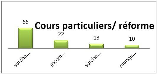 Ce qui ressort essentiellement  des données recueillies c’est que les programmes de réformes, compte tenu de leur surcharge, ne peuvent pas être appliqués dans leur globalité, dans les classes d’examen, où les formes d’organisation des séquences d’enseignement sont telles que le soutien scolaire devient la norme à laquelle élèves et parents doivent s’y conformer. Ce qui est souligné en particulier c’est l’incapacité actuelle de l’école à assurer la réussite pour tous, prescrite par le texte de réforme. Seuls les enfants accompagnés sur leur parcours semblent résorber leurs difficultés d’apprentissage.