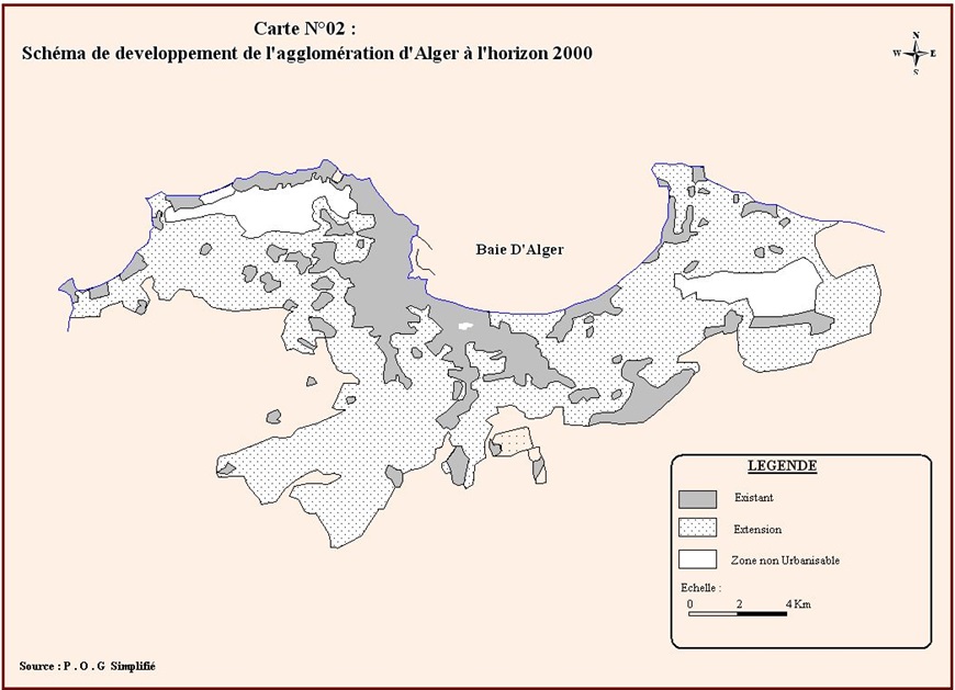 Ainsi, pour le P.O.G. l’aménagement futur de l’agglomération algéroise s’organisait autour de trois grandes bandes urbanisées, caractérisées chacune par la prédominance d’une fonction urbaine. Ces bandes urbanisées étaient séparées par de larges espaces réservés au tourisme et aux loisirs.