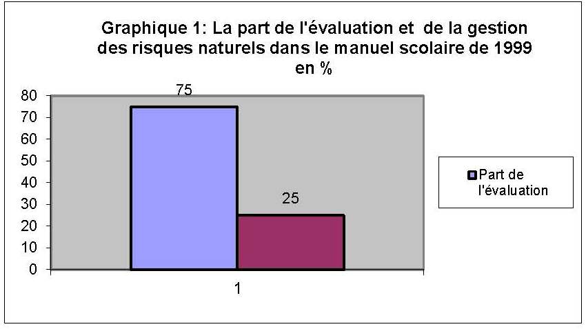 -Le contenu des leçons est centré sur l’évaluation des risques. En effet, 36 (75%) éléments (voir les 2 grilles dans l’annexe) relèvent du champ de l’évaluation des risques c’est-à-dire que les 3/4 des connaissances relèvent du champ de l’évaluation alors que le reste c’est-à-dire 25 % (le 1/4 des connaissances) relèvent du champ de la gestion comme le montre clairement le graphique 1en annexes. Il apparaît donc clairement que le contenu du manuel scolaire est centré sur l’évaluation alors que la gestion des risques est assez marginalisée.