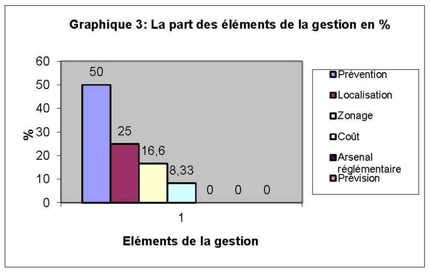 La moitié du contenu en matière de gestion est consacrée à la prévention. Les mesures réglementaires, la prévision et l’assurance ne sont jamais évoquées. Le graphique 3 ci-dessous clarifie davantage les données. Après les critiques que nous avons adressées au contenu du manuel de 1999, notamment le fait de considérer l’Homme comme une victime et non pas comme un agent dynamique capable de bien gérer les risques naturels, les auteurs du même manuel réédité en 2009 ont rectifié le tir pour tenir compte de nos remarques.