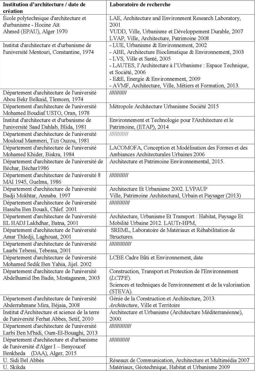 Tableau 1 : Les laboratoires de recherche affiliés à l’enseignement de l’architecture. Liste élaborée à partir des données Internet
