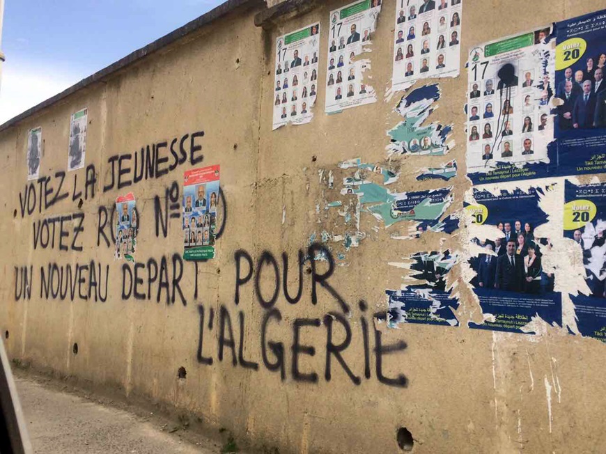 Dans les zones périphériques comme au centre-ville, ce sont les slogans du RCD qui s’affichent le plus. Les militants de ce parti s’approprient les espaces à travers l’inscription de l’acronyme de leur parti et des slogans dans certains contextes, notamment électoraux. Un graffiti apposé aux alentours de la gare multimodale renseigne sur cette tendance. Le choix du support recevant ce graffiti répond à un souci de diffusion des slogans électoraux qui se succèdent depuis 2011. Pour les élections législatives du 04 mai 2017, le parti a choisi un jeune universitaire pour conduire sa liste. Le slogan de la figure 1 [Votez la jeunesse / Votez RCD N° 40 / Un nouveau départ pour l’Algérie] prend la place de [La Kabylie belle et rebelle votera RCD][6] et vient alors appuyer cette entreprise de rajeunissement et de renouveau, et tente d’afficher de la cohérence dans le contenu.