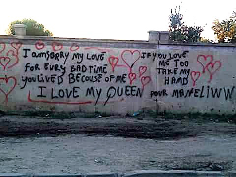 C’est le cas du graffiti de la figure 4 [I am sorry my love for every bad time you lived because of me / if you love me too, take my hand / I love my queen] suivi d’une dédicace dans un mélange de français et de kabyle [POUR MANEL IW] : « Je suis désolé mon amour pour chaque mauvais moment que tu as vécu à cause de moi / Si tu m’aimes aussi, prends ma main / J’aime ma reine / pour ma Manel ». Le tout entouré de petits cœurs en couleur rouge.