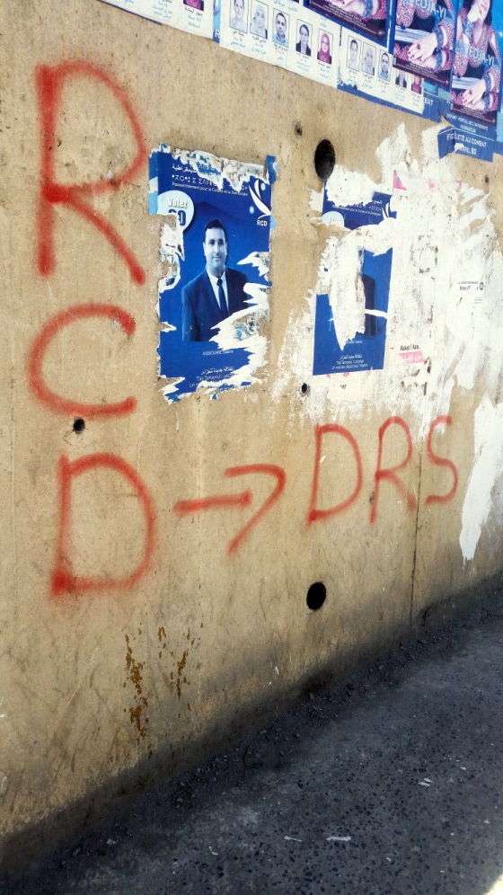 Le choix de l’emplacement, de la langue et de l’énoncé répond à une stratégie visant à influer sur l’électorat local. Néanmoins, des réactions, commentaires ou effacement sont visibles dans le paysage urbain. Les inscriptions, notamment politiques, suscitent débat, mais provoquent parfois des polémiques. Pour le cas du RCD, nous remarquons le détournement de son sigle sur le même mur dans la figure 6 : [RCD →DRS]. Ce détournement se veut une façon de tacler le parti, suspecté d’avoir des accointances avec le Département du Renseignement et de la Sécurité algérien.