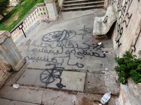 Une pré-enquête a conduit nos pas vers les graffiti qui se trouvaient dans l’enceinte de l’Université de Mostaganem (ex-Institut de Technologie Agricole). Mais après quelques escapades dans les différents quartiers de la ville, nous avons constaté que l’espace public mostaganémois était beaucoup plus foisonnant en termes d’inscriptions murales et de discours et offre à nos yeux un terrain de recherche riche en discours et en indices de sociabilité. Nous avons donc décidé d’interroger l’espace public pour comprendre les mécanismes qui le lient à la pratique du graffiti tout en examinant le fonctionnement de ces derniers comme capteur social des dynamiques socio-urbaines.