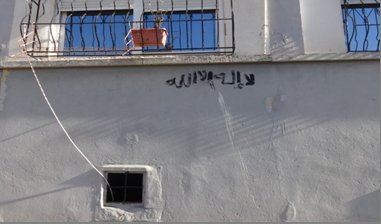 Ce graffiti au contenu politico-idéologique subversif date justement de 1992. Il a été réalisé juste après la fermeture, pour des raisons politiques, de la Mosquée Redouane[1] à Mostaganem. Le graffiti est écrit en arabe institutionnel suivi de l’acronyme FIS en lettres latines (Front Islamique du Salut).