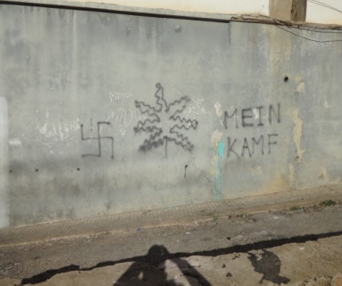 Nous avons également remarqué le fort usage de signes et de symboles dans le graffiti mostaganémois. « Les dynamiques urbaines dans toute leur diversité s’accomplissent à travers les différentes langues en présence dans le milieu urbain et à travers également un arsenal de représentations figuratives » (Ouaras, 2009, p. 165). La croix gammée, symbole du nazisme d’Adolf Hitler, y figure en abondance Cette étonnante trouvaille à Mostaganem nous a intrigués au point d’en faire un point de fixation pour en connaître les tenants et les aboutissants. Interrogés à ce sujet, la plupart des informateurs ont répondu que ces symboles ont atterri à Mostaganem par méconnaissance du sens qu’ils renferment ou par simple mimétisme des discours et images circulant sur les réseaux sociaux. Ces représentations restent, cependant, incomplètes dans la mesure où l’instance énonciative des deux symboles nazis demeure insaisissable. Il nous était impossible d’entrer en contact avec elle, qui est la seule à détenir le sens exact de son geste et à savoir la fonction qu’elle assigne à ce discours nazi.
