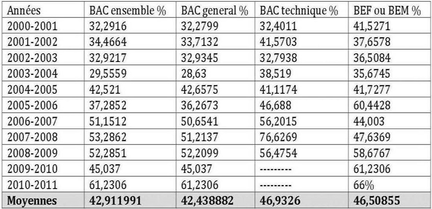 Tableau 2 : les taux de réussite au Brevet d’enseignement moyen et au Baccalauréat