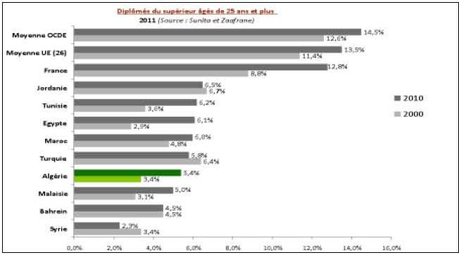 Mais quoique qu’il en soit, le nombre de diplômés universitaires en Algérie ne dépassait pas les 3,4% en 2000 et 5,4% en 2010 (graphique 6). Ce taux reste en deçà de celui du Maroc (6%), celui de la Tunisie (6,2%) et celui de l’OCDE (14,50%).
