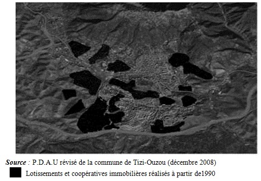 A la faveur de cette nouvelle législation et devant l'absence d'instruments d'aménagement et d'urbanisme non encore élaborés ou approuvés, la ville de Tizi-­Ouzou subit passivement la multiplication de lotissements et de coopératives immobilières, situation aggravée par l’instabilité régnant au niveau de l’Autorité communale. La libéralisation du marché a eu pour conséquence la consommation effrénée s’apparentant par bien des aspects à dilapidation. Ce phénomène s’est bien évidemment accompagné d’une vague de spéculation sur le patrimoine foncier public de la ville –déjà maigre- au profit d'opérateurs privés en quête de rentes de tous genres. La carte n°3 montre bien le deuxième éclatement de la ville de Tizi-Ouzou.