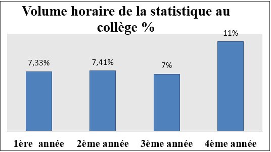 Le volume horaire : la statistique  est négligeable par rapport aux autres chapitres mathématiques (algèbre/géométrie), ce qui se traduit par le faible pourcentage du volume horaire de l’enseignement des statistiques par rapport au volume global d’enseignement des mathématique : seulement 7% en première, deuxième et troisième année et 11% en quatrième année (voir graphe ci-dessous).