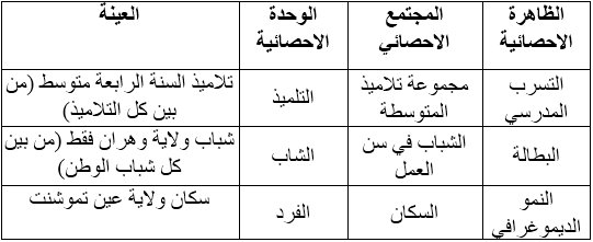 العينة: (échantillon)هي جزء من المجتمع الإحصائي، ولكن ليس أي جزء، إنه الجزء الذي يمثل المجتمع أحسن تمثيل. يختلف حجم العينة حسب أهمية الدراسة و حسب الإمكانيات المادية و البشرية المتاحة للقيام بهذه الدراسة. الاعتماد على أسلوب العينة متبع في أغلب الدراسات الميدانية و هذا لاستحالة جمع المعلومات الإحصائية من كل الوحدات التي تشكل المجتمع المدروس أو بما يسمى بالحصر الشامل (enquête exhaustive) مثل التعداد العام للسكان في الجزائر ،مثال: