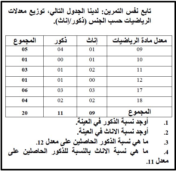 1. أوجد نسبة الذكور في العينة: نريد معرفة نصيب الذكور من مجموع كل التلاميذ في القسم (أي 20 تلميذ)