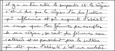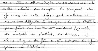 L’étudiante 6 associe le problème de l’obésité à l’analphabétisme des femmes ne leur permettant pas la lecture de documents écrits ou même la compréhension de documents audiovisuels explicitant les dangers de l’obésité. Ajoutons à cela, l’absence de structures sportives et les habitudes alimentaires. Ce témoignage atteste donc de l’état de santé détérioré des femmes. Ce vécu a conféré à l’étudiante des connaissances élargies et évoque les effets néfastes de l’obésité sur l’infécondité des femmes.