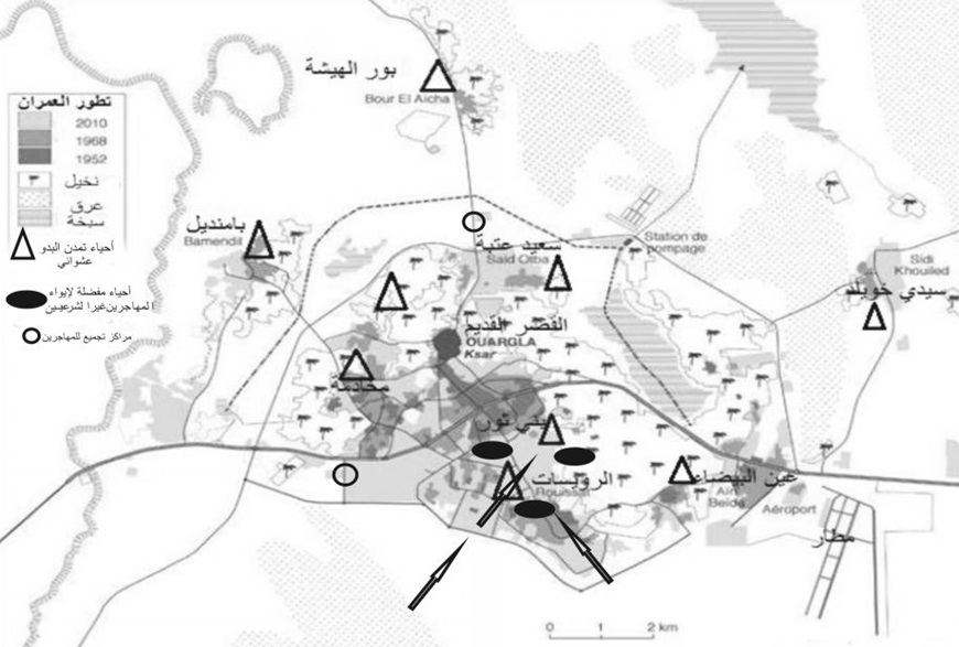 الشكل2: مدينة  ورلة  تظهر عليها مناطق السكن المفضلة للمهاجرين غير الشرعيين