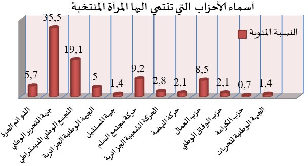 • أن يكون مستوى التمثيل لدى الحزب مرتفعا. وهذا حال بعض الأحزاب التي استطاعت معها المرأة الظفر بمقعد تمثيلي على شاكلة حزبي جبهة التحرير الوطني وحزب التجمع الوطني الديمقراطي. فأعلى نسبتي انخراط ضمن النساء المستجوبات سجلناه بحزب جبهة التحرير الوطني بـ 5 %، يليه التجمع الوطني الديمقراطي 19.1% ، لتنخفض النسبة إلى 09% في حركة مجتمع السلم، و08% في حزب العمال، وتبقى في انخفاض متواصل من 5%  في الجبهة الوطنية الجزائرية إلى 2 و1%  في باقي الأحزاب.