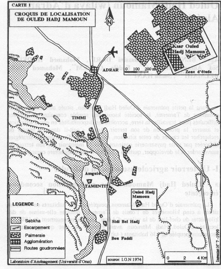 La croissance démographique récente de cette petite communauté sédentaire a permis la constitution du regroupement des Ouled Hadj Mamoun en tant qu'agglomération secondaire de la commune de Tamentit qui est mi haut lieu de l'histoire du Sahara. Malgré la reprise du travail agricole et l'amélioration du petit réseau hydraulique local, la production culturale demeure médiocre et dans l'ensemble, largement autoconsommée. Peut-on alors, cerner les causes principales de ces difficultés?