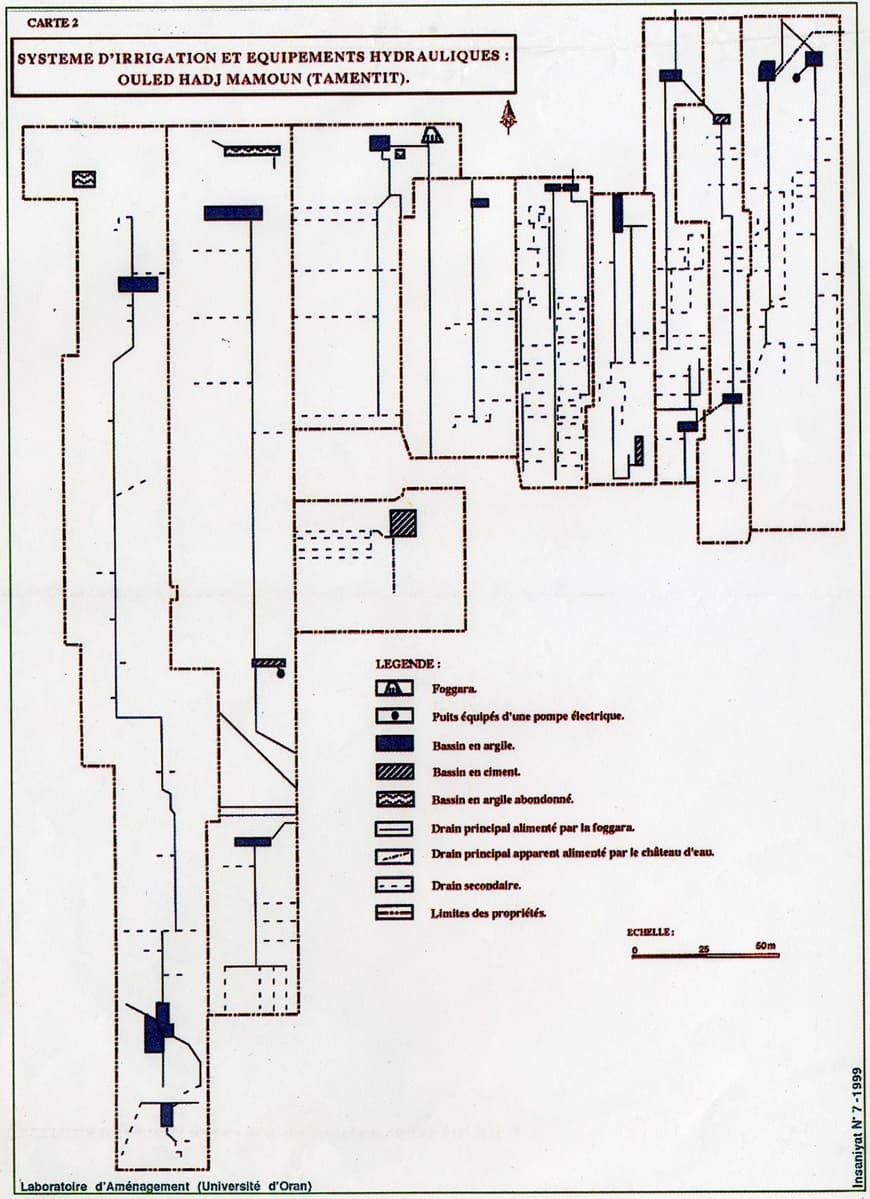 Aujourd'hui, la palmeraie d'Ouled Hadj Mamoun est alimentée par une seule foggara [2] qui se localise à l'est du parcellaire étudié. Une kesria (foggara à peigne) permet la distribution de l'eau par gravité (Carte 2). Le système de distribution hydraulique est tout à fait typique de cette région du Sahara. Là, la foggara [3] est reliée à un réseau de drains principaux, apparents ou enterrés, parfois cimentés, qui desservent 19 majens (bassin de stockage de l'eau) construits en argile et 4 autres réalisés en ciment; en fin de parcours du réseau, de petites seguias traditionnelles, modulables, alimentent les parcelles cultivées.