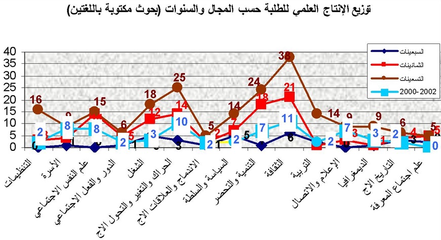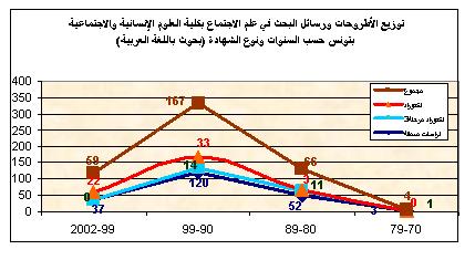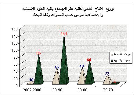لقد شهدت الفترة المتراوحة بين 1970 و1975 غيابا تماما لأي بحث باللغة العربية، و توجد أربعة بحوث فقط من سنة 1976 إلى سنة 1979. إن غالبية البحوث المودعة بالكلية التي تخص الفترة المشار إليها (أي السبيعينات) مكتوبة باللغة الفرنسية. كما أنه لم يناقش أي بحث سواء باللغة العربية أو الفرنسية خلال سنة 1994، ويعود ذلك، إلى الإصلاحات التي أجريت على نظام الشهادات العلمية الذي بدأ العمل به خلال السنة السالفة الذكر. كما شهدت الفترة المتراوحة بين سنة 1985 وسنة 1986 ضعفا شديدا في مجال الإنتاج السوسيولوجي للطلبة، ويعزى ذلك، بتقديرنا إلى نظام الشهادات العلمية القديم الذي يخول للباحث التسجيل لفترة زمنية طويلة دون إلزام فعلي بمدة زمنية محددة لإنهاء البحوث، وهو ما أفضى إلى إصلاح نظام الشهادات ومدتها الزمنية ونوعها.