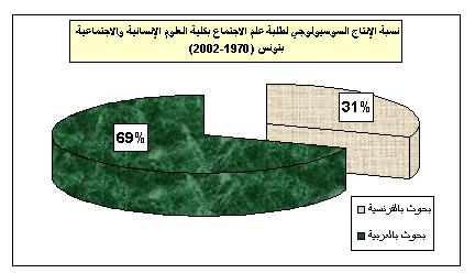 أن نشأة قسم علم الاجتماع بكلية العلوم الإنسانية والاجتماعية بتونس[6] حديث نسبيا، إذ صدر أول أمر ينظم الإجازة في علم الاجتماع في 14 أفريل 1961، وشهد هذا الأمر العديد من التعديلات. ولقد تنامى استقطاب الطلبة في قسم علم الاجتماع بداية من أواسط السبعينات، وهو ما يفسر ضعف الإنتاج العلمي للطلبة في فترة السبعينات والثمانينات بالمقارنة مع فترة التسعينات. وتجدر الإشارة، إلى ارتفاع عدد البحوث المكتوبة باللغة الفرنسية في فترة السبعينات مقارنة بالبحوث المكتوبة باللغة العربية، حيث بلغ عدد البحوث باللغة الفرنسية في الفترة المشار إليها، 27 بحث مقابل 4 بحوث باللغة العربية. ويبلغ عدد البحوث باللغة الفرنسية التي نوقشت في كليات أجنبية 22 بحثا منها 17 بحث نوقشت في كليات فرنسية، واثنان في كندا وبحث واحد في أوسلو وبحثان في الجزائر. وتتوزع هذه البحوث حسب الفترات الزمنية على النحو التالي: 19 بحثا نوقش في السبعينات وبداية الثمانينات، في كليات أجنبية مقابل ثلاثة بحوث فقط نوقشت في التسعينات. ويبلغ عدد البحوث المكتوبة باللغة الفرنسية 20 بحثا وبحثان باللغة الإنكليزية، حسب المعطيات المتوفرة في فهارس البحوث التي أشرنا إليها.. وفي الآن ذاته اتجهت البحوث المكتوبة باللغة العربية إلى الارتفاع في فترة التسعينات. ويبين الرسمين التاليين توزيع البحوث حسب الفترات الزمنية وحسب لغة البحث :