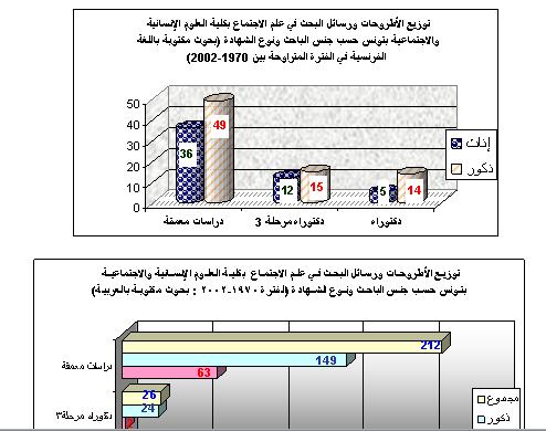 الرسائل المكتوبة بإحدى اللغتين الرسميتين في تونس (العربية أو الفرنسية) مرتفع بالمقارنة مع عدد البحوث المعدة في إطار شهادة الدكتوراه (77 أطروحة مقابل 350 رسالة بحث). كما بلغ عدد الأطروحات باللغة العربية 58 بحث منها 50 بحث لذكور وثمانية بحوث لإناث، كما بلغ عدد الأطروحات باللغة الفرنسية 19 بحث منها 14 بحث لذكور وخمسة بحوث لإناث. و تفيد هذه المعطيات الإحصائية بأن عددا من الطلبة لم يواصلوا دراساتهم العليا، وهو ما يجعلنا نتساءل عن المسار البحثي والمهني للباحثين؟ وعن الأسباب الكامنة وراء هذا الانقطاع، فلقد تبين لنا ونحن نتحفص أسماء الباحثين خاصة في فترة السبعينات والثمانينات بأن قلة منهم من أنهى دراساته العليا مستثنين طلبة أواخر التسعينات على أساس، أنه بالإمكان أن يكون بعضهم أو غالبيتهم ما زال مسجلا في شهادة الدكتوراه. ويبين الرسمين البيانيين التاليين توزيع البحوث حسب جنس الباحث ونوع الشهادة ولغة البحث: