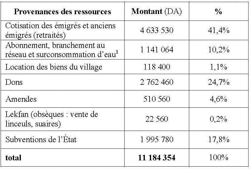 31 Ces données nous ont été fournies par les membres des comités de villages qui nous ont expliqué leurs systèmes des cotisations, notamment le nombre des cotisants et le montant des cotisations par personne. Nos calculs nous ont permis de réaliser ce tableau. Nous disposons d’autres données sur les systèmes de cotisation concernant d’autres villages de la région mais qui ne nous permettent pas de calculer la somme totale provenant de ces cotisations (nous n’avons pas le nombre exacte des cotisants). Par exemple les émigrés du village Ikoussa cotisent 40 euros par an, les émigrés du village Tazrout cotisent 10 euros par mois et ceux du village Ath Iken cotisent 100 euros par an (les retraités cotisent 30 euros par an)…